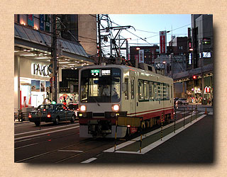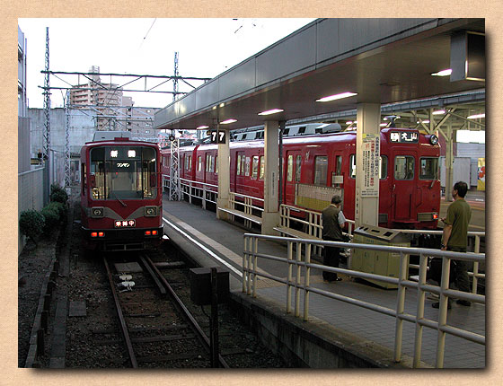 ■名鉄田神線 本日、最後の試乗は、名鉄田神線。美濃町線の電車を新岐阜駅に直通運転する目的で1970年に開設された路線である。 新関方面から来た電車は、競輪場前の信号扱い所を見ながら大きく左に曲がる。しばらく道路中央に敷かれた単線の軌道を走り、右に曲がったところが市ノ坪。今日乗ってきた岐阜市内線・揖斐線・美濃町線を走る電車の整備を行う工場が併設されている。 市ノ坪を出ると、左手から複線の線路が近づき、やがて合流する。1500V電化の立派な鉄道線路を路面電車規格の小型車両が走るさまは、なかなかユニークだ。 雑多な家屋が立ち並ぶ岐阜の下町を少し走ると、もう、終点の新岐阜である。夕方の上り電車ということもあるけれど、下車した客は10人もいなかった。 ■試乗を終えて今回レポートした各線("名鉄600V区間")は、毎年巨額の赤字を生んでおり、既に名鉄から廃止の届けや申請が提出されている。計画では、2005年3月末をもって、すべての路線の営業を終える予定である。 今回、各線に乗って感じたことは、名鉄は、利便性の向上のために、相応の努力をしてきたということだ。 けれども、鉄道事業者がこれほどまでの努力をしても、市民を振り返らせることはできなかった。 たとえば、路面にペンキで描かれただけの電停。 名鉄から、廃止を突きつけられた地元自治体では、他の鉄道事業者による営業肩代わりの道を模索したりしているようだが、"何が何でも路線を残そう"という熱意は、あまりないようにも見受けられる。 鉄道ファンの立場から言えば、古い地方軌道の面影を今に伝える"名鉄600V区間"は、大変貴重で興味深い存在ではあるけれど、鉄道は、ファンのために存在している訳ではない。 参考リンク |