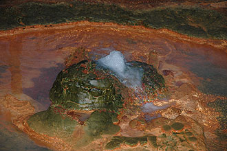 島根県西部に湧く、我が国には珍しい間歇泉。 既に夕闇が迫っていたが、温泉が吹き出す様子を見たくて、まずは源泉地に行ってみた。 金網で囲まれた池に茶色の温泉水が満たされている。更にその奥、地面に10cmほどの穴があいているが、ここが噴出孔のようだ。約30分周期で噴出がみられるというので、しばらく待つことにした。 周囲はうっそうとした森で、物音ひとつしない。時どき、噴出孔に目をやるが、ちっとも変化がない。することがないので、案内板の説明などを読むことにする。 それによると、一般的な間歇泉は、高温蒸気の圧力で噴出するものが多いが、木部谷のそれは、炭酸ガスの圧力で吹き出すのだという。 しかし、それにしても寒い。風こそないが、昨夜降った雪の上に立つ足先は氷のように冷たく、凍傷になってしまいそうだ。 炭酸飲料の栓を抜いたときのような、白い泡がちょろちょろ出始めたかと思うと、みるみる高さが増して、1mくらいの"噴水"になった。ぼごぼごとガスの吹き出る音が聞こえ、かすかな硫化水素臭が漂う。写真をご覧になれば分かると思うが、細かい気泡が含まれているので、公園などにある人工の噴水とは、飛沫のかたちがずいぶん違う。 珍しい間歇泉のショーを見物できたので、大満足で風呂につかることにする。 浴室はタイル張りで、既に析出物が厚く沈着している。よく見ると茶色の温泉水の水面には、白く薄い膜が浮いているが、これはカルシウムが析出したもので、もちろん入浴客の垢ではない。 中国道六日市ICから約15分と、交通の便も比較的いい。時間に余裕をもって訪問し、間歇泉の吹き出る様子もあわせてご覧になることをお勧めする。 お気に入り指数:★★★★★(但し、間歇泉の見物も含んだ評価)